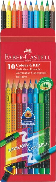 Radierbare Buntstifte in ergonomischer Dreikantform mit Soft-Grip-Zone. Mit farbig passendem Radiergummi für saubere Korrekturen und exaktes Arbeiten. Besonders wichtig im Schulalltag. 10 Farben im Kartonetui. Umweltverträglicher Lack auf Wasserbasis. Hol