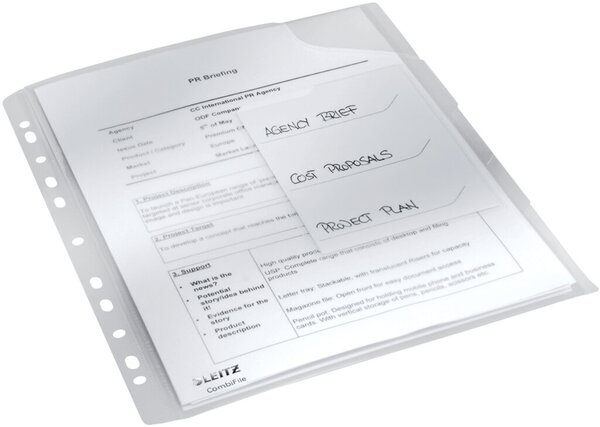 CombiFile Hülle DIN A4, glasklare Transparenz für eine optimale Sichtbarkeit der Unterlagen. Patentierter ein- und ausklappbarer Lochrand macht die Hülle flexibel für Ablage im Ordner. Zum Stapeln auf dem Schreibtisch oder unterwegs. Mit Beschriftungsstre
