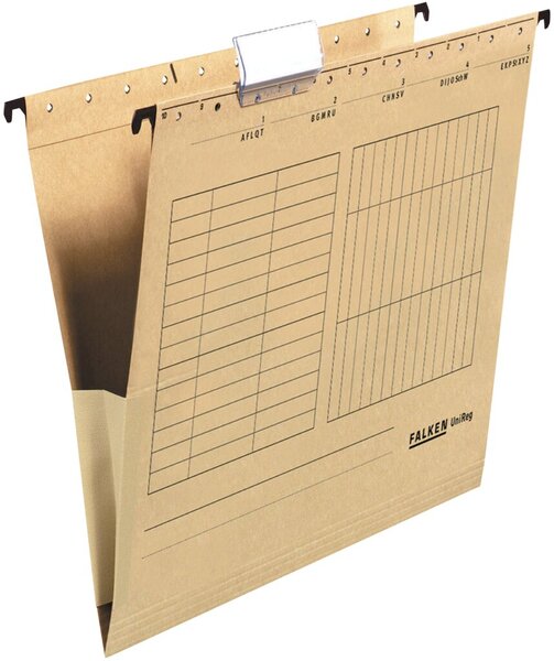 Hängetasche UniReg aus 230 g/qm Recyclingkarton mit seitlichen Leinenfröschen. Für Format DIN A4. Fassungsvermögen: ca. 350 Blatt (80 g/qm). Umweltzeichen Blauer Engel.