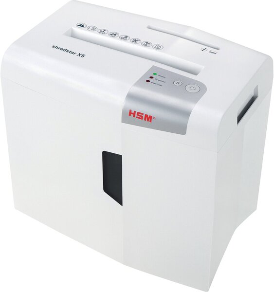 HSM Aktenvernichter shredstar X5, 4,5 x 30 mm Partikelschnitt, Sicherheitsstufe P-4, Leistung 5 Blatt, Auffangvolumen 18 Liter, Maße 345 x 385 x 245 mm, weiß/silber
