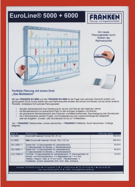 Rücken Sie wichtige Informationen ins Blickfeld mit diesem magnetischen Dokumentenhalter. Für magnethaftende Tafeln oder Metallhintergründe. Mattierte, weichmacherfreie Hartfolie. Farbige Umrandung. Stärke: 0,32 mm. Auf 3 Seiten der Rückseite sind Magnets