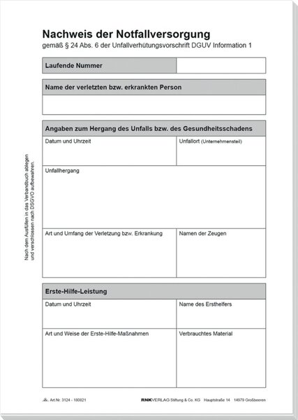 Block zum Nachweis der Notfallversorgung, DIN A5, 50 Blatt (80 g/qm). Jede Erste-Hilfe-Leistung muss nach der DGUV Vorschrift 1 dokumentiert werden. Diese muss fünf Jahre lang verfügbar gehalten werden. Nach DSGVO müssen die ausgefüllten Blätter verschlos