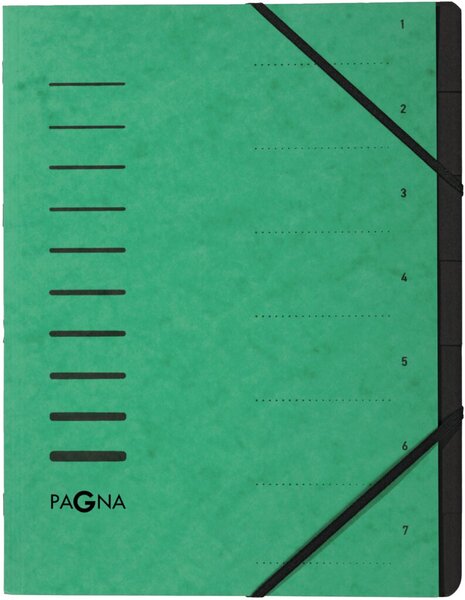 Ordnungsmappe, 7 oder 12 Fächer mit Taben für schnellen Zugriff auf Unterlagen. Aus strapazierfähigem Pressspan. Mit Eckspanngummi, 2 Schaulöchern im Buchblock. Schwarze Griffregister aus stabilem Karton. Aufdruck 1 - 7 oder 1 - 12 auf dem Deckel, individ