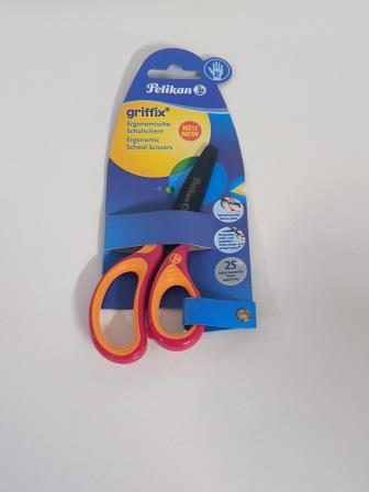 Griffix Schulscheren für Links- und Rechtshänder. Mit lachendem Griffix-Gesicht für die richtige Handhabung und Namensschild. Durch die Titannitrid-Beschichtung ist sie drei mal härter als Stahl.