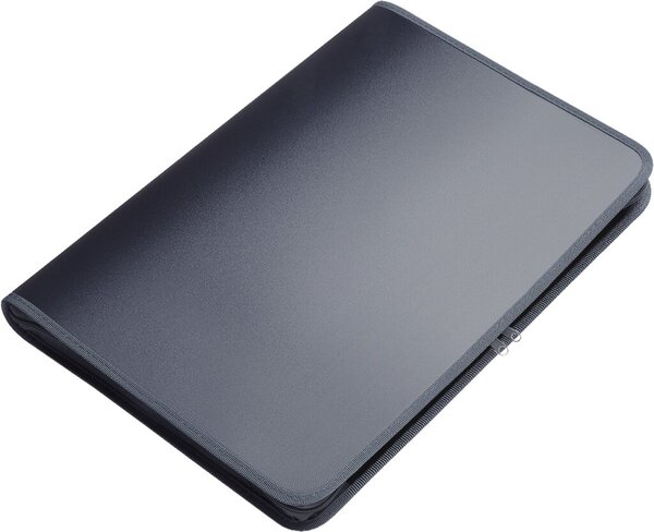 Portfolio aus trasluzenter PP-Folie und farbigem Saum. Folienstärke: 500 my, Mit Textil-Reißverschluss. 30 mm Rücken.